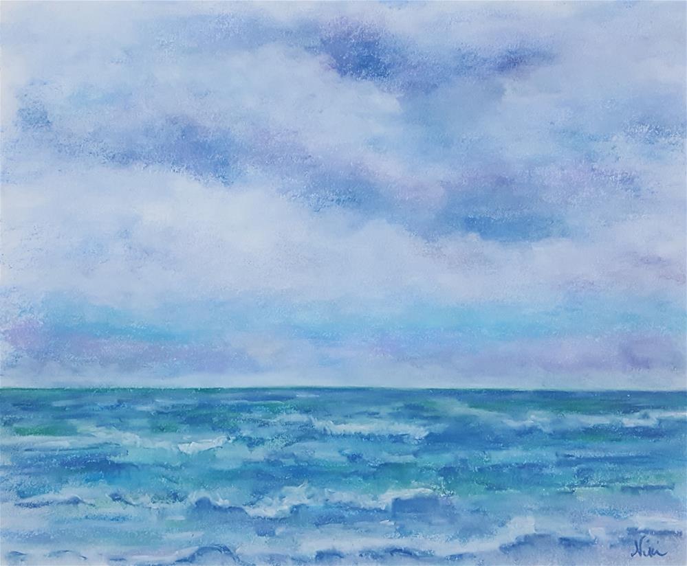 Created with soft pastel on drawing paper, this impressionistic ocean scene features a view of the Pacific ocean on a peaceful, empty day.