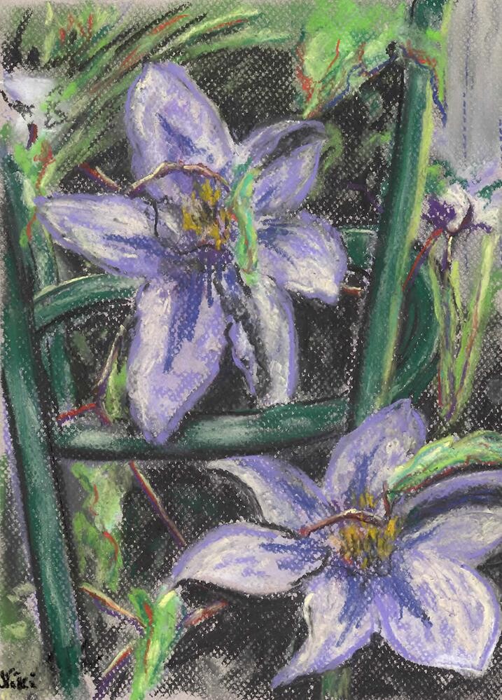 Soft pastel on Canson Mi-Teintes paper (Moonstone color) Featuring flowers growing vigorously around a trellis in a summer garden Soft pastel on Canson Mi-Teintes paper (Moonstone color) Featuring flowers growing vigorously around a trellis in a summer garden |