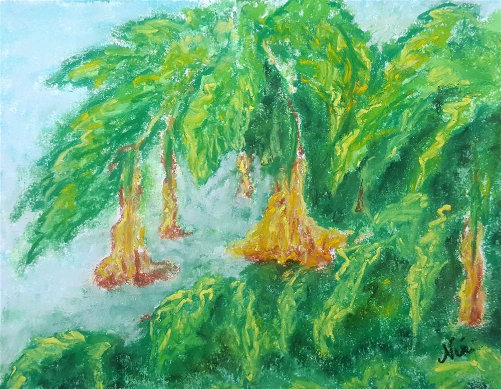 Soft pastel on watercolor paper-- always love to see trumpet flowers among the spring blooms! Piece will be carefully packaged with Glassine paper cover to protect it until you are ready to frame the artwork under glass.