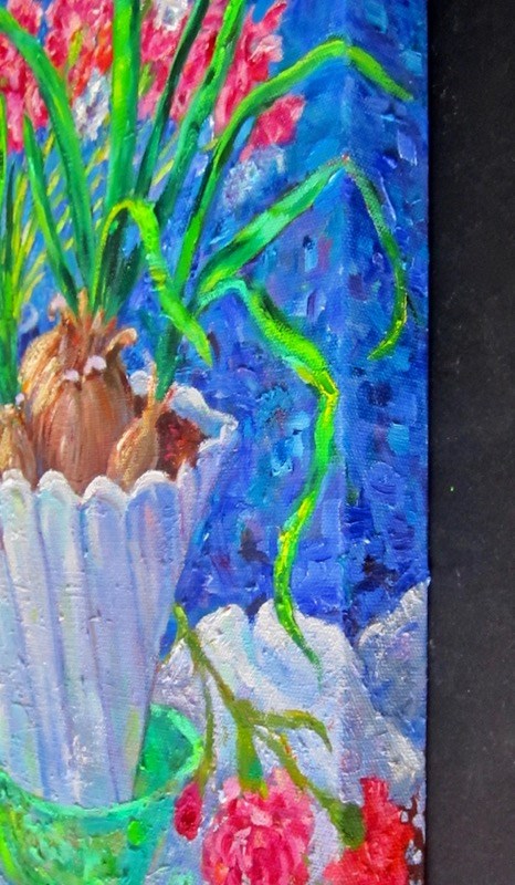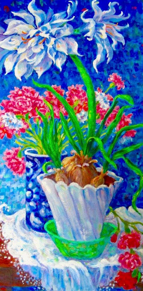 This white double amaryllis, aptly named "Snow Queen," is the star of this still life painting. But it also seems symbolic of the hope and good wishes we share with one another at the New Year. Painted in the pointillistic style, a few dabs at a time, it has been a project for many months, and now that it's finished, it represents the high hopes I share with all for a peaceful and prosperous New Year! This white double amaryllis, aptly named "Snow Queen," is the star of this still life painting. But it also seems symbolic of the hope and good wishes we share with one another at the New Year. Painted in the pointillistic style, a few dabs at a time, it has been a project for many months, and now that it's finished, it represents the high hopes I share with all for a peaceful and prosperous New Year! |
