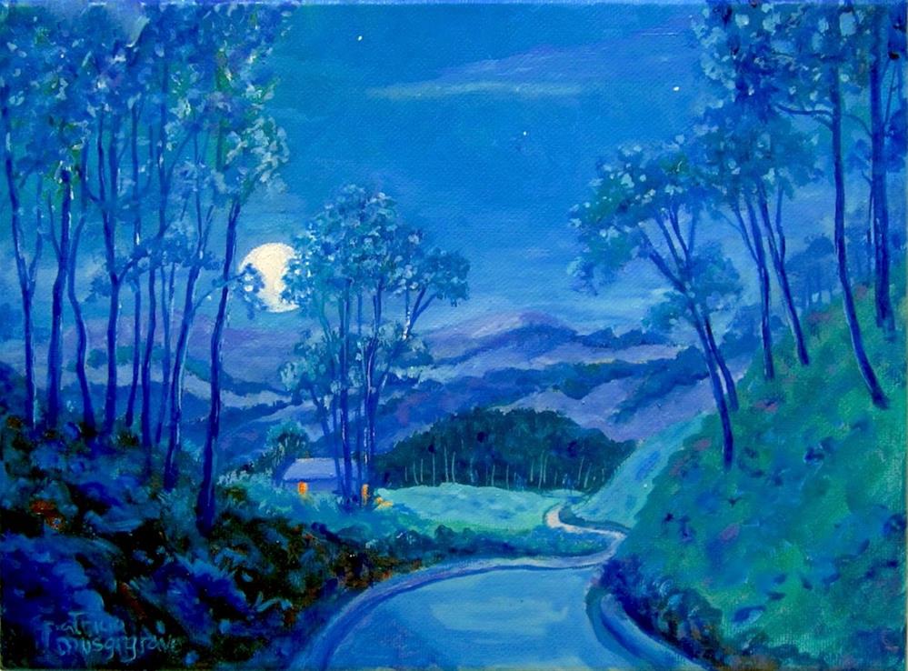 A full moon rises over the road late at night, lights in the distance mean you're almost home.