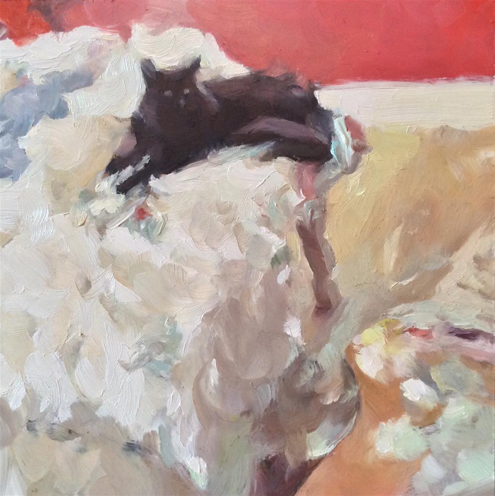 This is what is by me most times when I am painting - my cat. During the winter months, I paint mostly in my bedroom where it's warm and comfortable, sitting on the edge of the bed, facing my easel. You can see a part of my palette in the corner. My cat likes to watch me paint - thus the name.