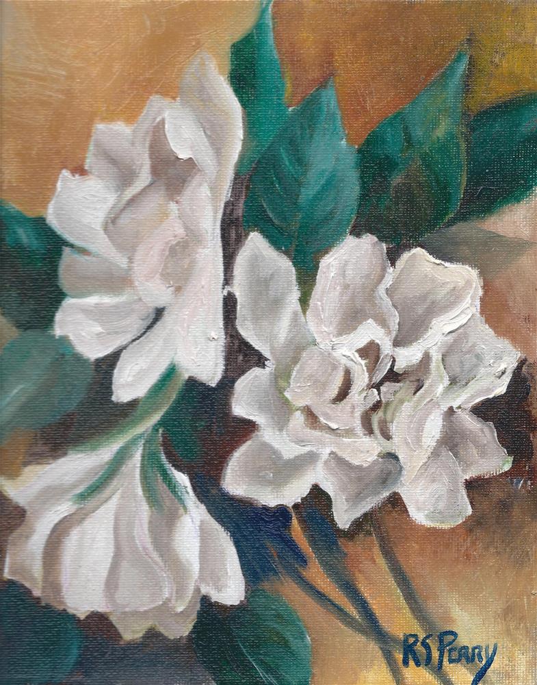 A very late April freeze of several days killed all the buds and leaves of my two huge gardenia bushes. These bushes last year had hundreds of blooms. This year there was nothing. I am uncertain whether they will bloom next spring, although some leaves have come back. This painting was done from photographs I took of my previous years gardenias. A very late April freeze of several days killed all the buds and leaves of my two huge gardenia bushes. These bushes last year had hundreds of blooms. This year there was nothing. I am uncertain whether they will bloom next spring, although some leaves have come back. This painting was done from photographs I took of my previous years gardenias. |
