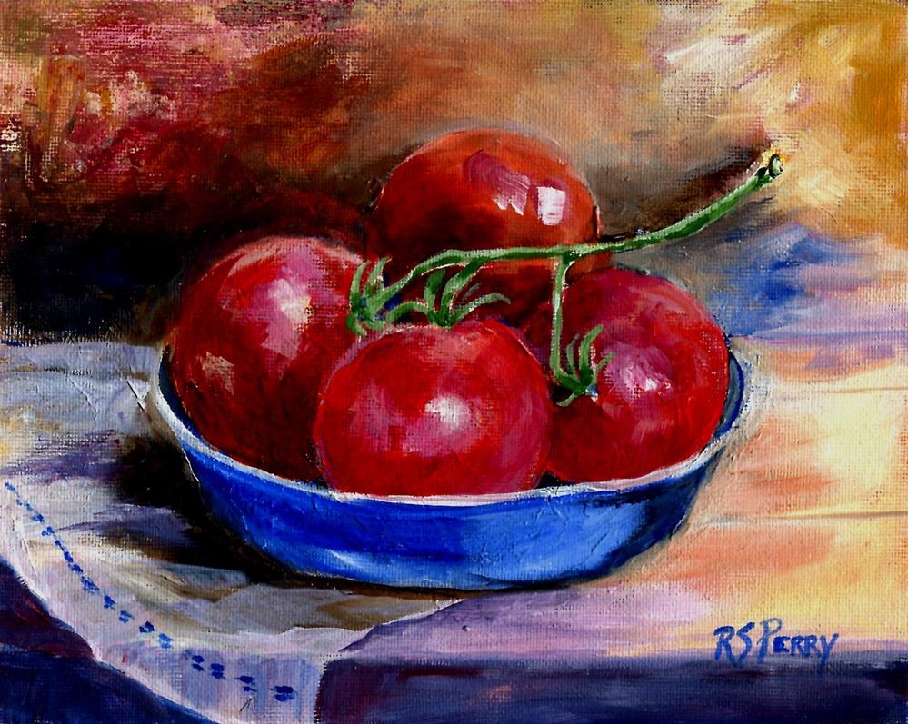 Four juicy red tomatoes in a bright blue bowl display well on an old table with a runner partially shown on the left. I think the shadows make this still life rather exciting! Four juicy red tomatoes in a bright blue bowl display well on an old table with a runner partially shown on the left. I think the shadows make this still life rather exciting! |