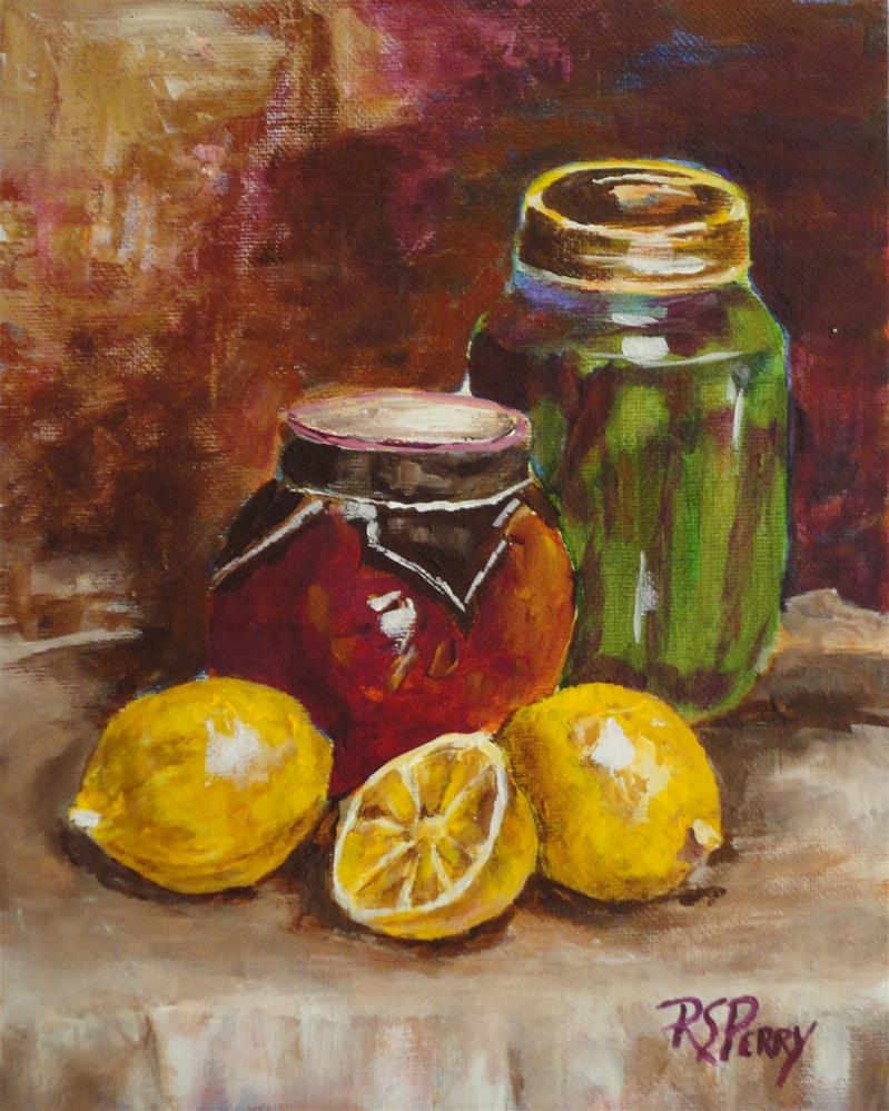 The large jar is home-canned okra. The smaller round jar was bought at a Church sale and is some kind of jelly. The yellow lemons show off the bright colors of red and green. This one was lots of fun to paint! The large jar is home-canned okra. The smaller round jar was bought at a Church sale and is some kind of jelly. The yellow lemons show off the bright colors of red and green. This one was lots of fun to paint! |