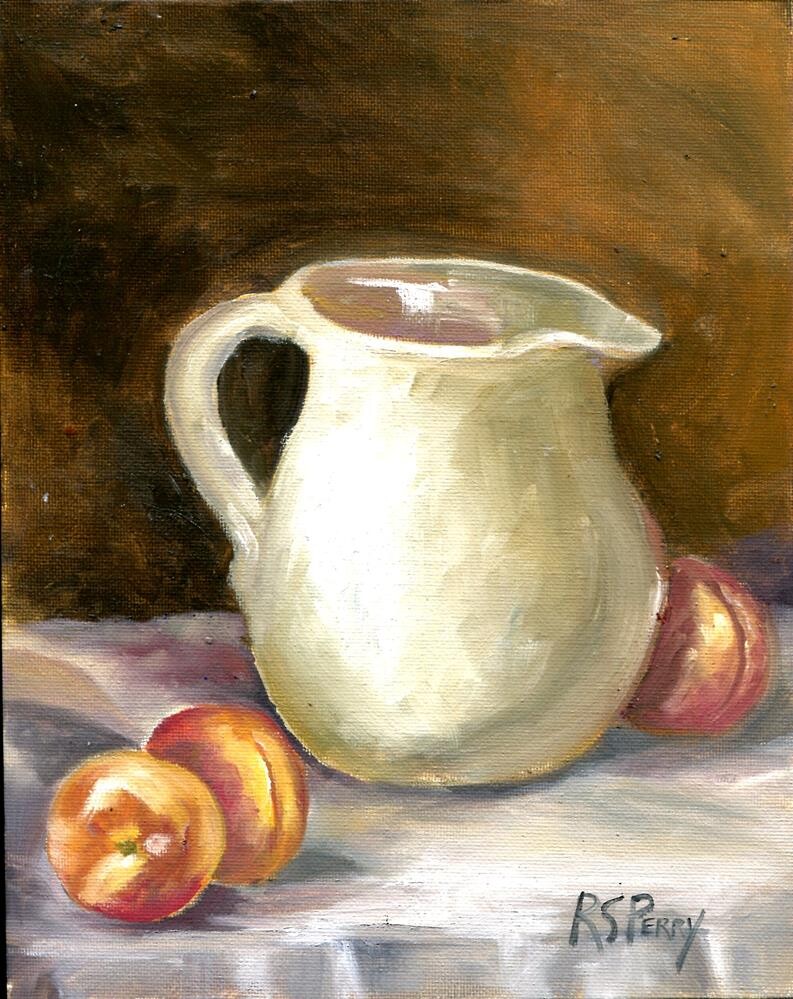 The challenge in this painting is to make the pitcher appear to be round! I deliberately left brush strokes on the pitcher, the tablecloh and the peaches. The challenge in this painting is to make the pitcher appear to be round! I deliberately left brush strokes on the pitcher, the tablecloh and the peaches. |