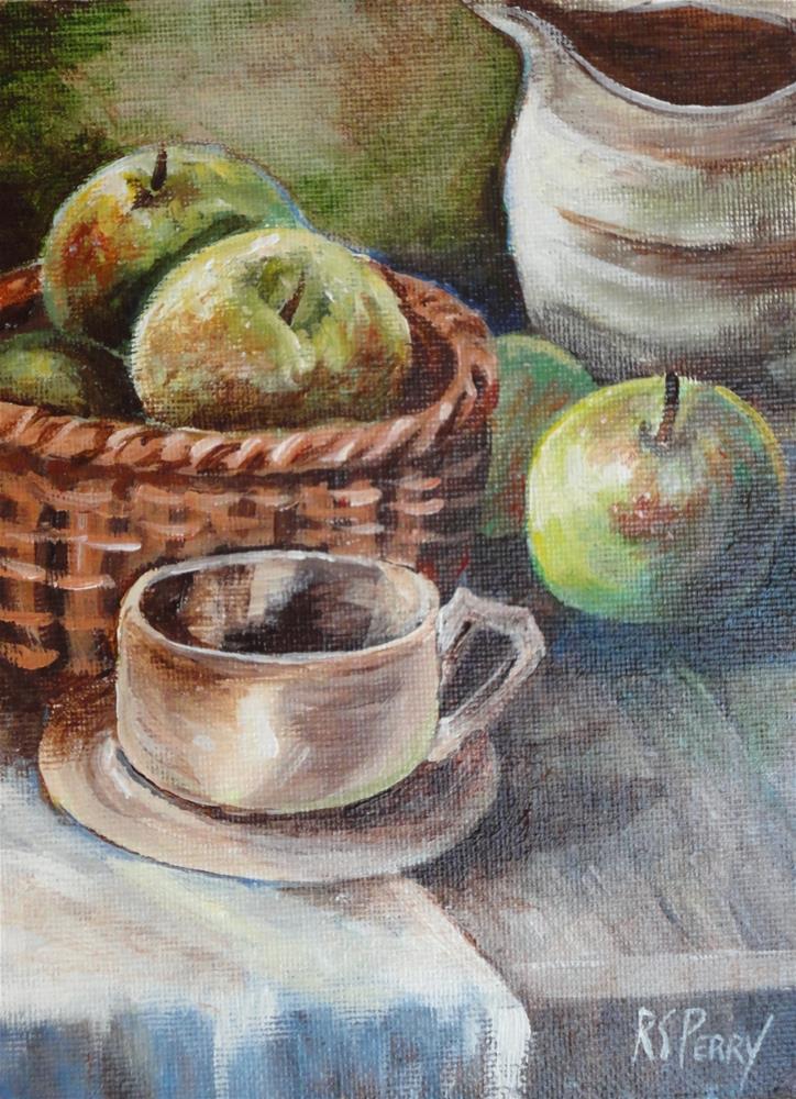 Arranging a still life can be fun. I use whatever I have on hand--in this case it was green apples and a cup of coffee. Arranging a still life can be fun. I use whatever I have on hand--in this case it was green apples and a cup of coffee. |