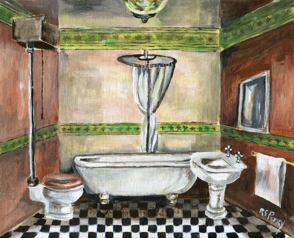 Other. This is a typical Victorian era bathroom with a wooden hightank toliet, a pedestal sink, and a clawfoot tub with a showercurtain suspended over it. Other. This is a typical Victorian era bathroom with a wooden hightank toliet, a pedestal sink, and a clawfoot tub with a showercurtain suspended over it. |