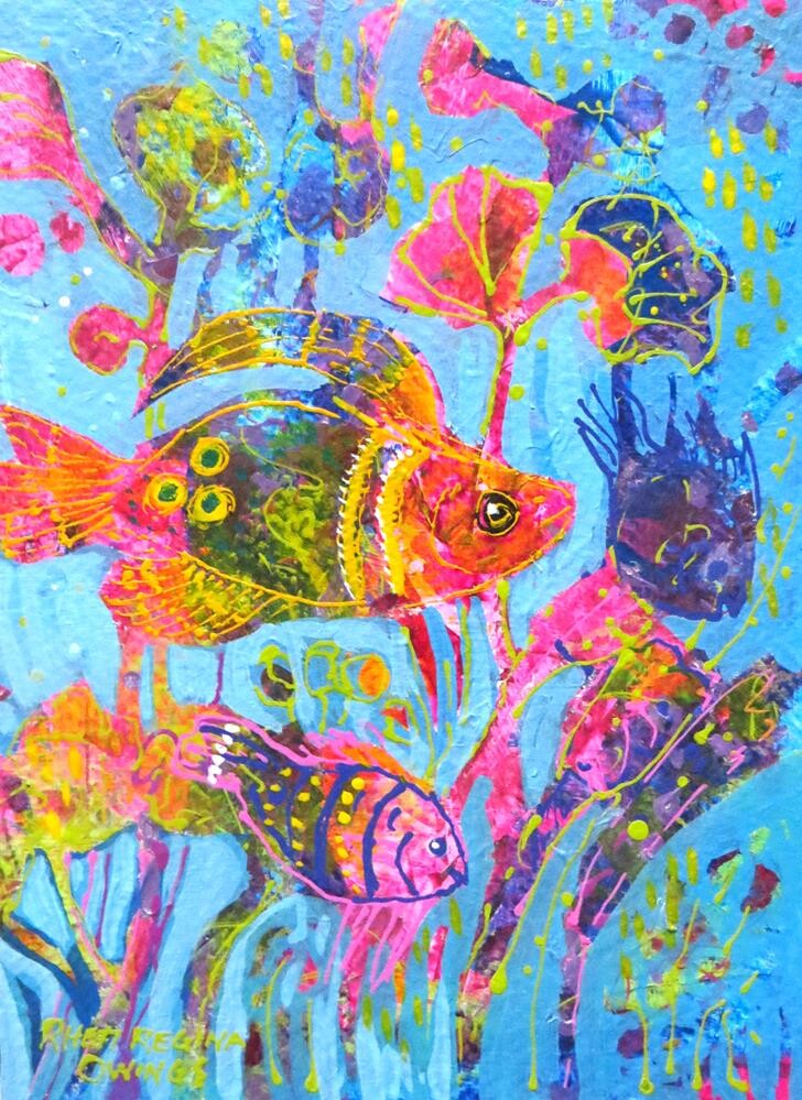 #995 Fishy This is a little experimental painting just for fun. I sprayed, splattered and painted acrylic inks onto a piece of 140 lb watercolor paper. When dry I drew out the fish and plants with chalk and began painting the negative space around the shapes. Adding a little thin acrylic ink lines with acrylics sparkled it up! Such fun! Matted to fit an 8” x 10” frame #995 Fishy This is a little experimental painting just for fun. I sprayed, splattered and painted acrylic inks onto a piece of 140 lb watercolor paper. When dry I drew out the fish and plants with chalk and began painting the negative space around the shapes. Adding a little thin acrylic ink lines with acrylics sparkled it up! Such fun! Matted to fit an 8” x 10” frame |