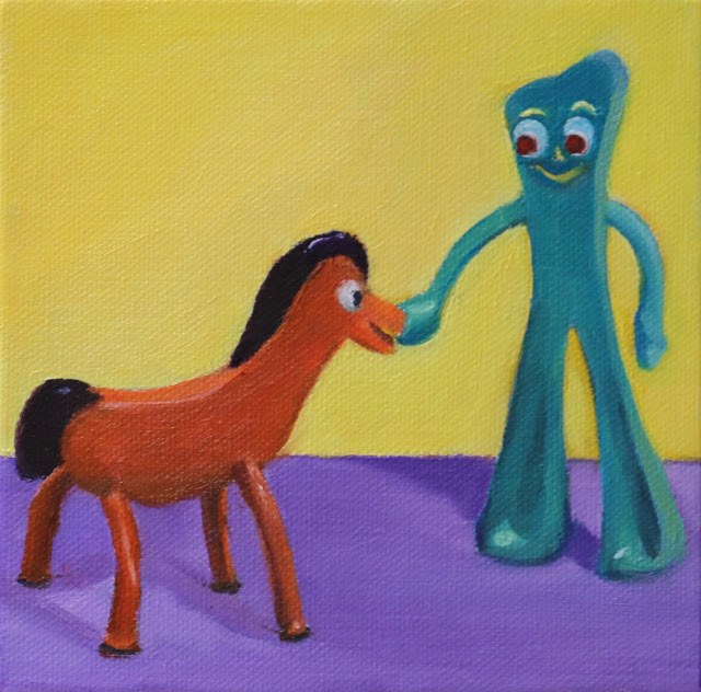 For some reason, I got it into my head that I wanted to paint Gumby and Pokey, something from my childhood, long, long ago. It’s been fun and funny to paint a subject like this that symbolizes the imagination and innocence of children; a time when anything was possible and the good creatures always won. I’ve found myself laughing as I painted these two figures and am already planning future paintings as I am now the proud owner of a whole clan of Gumbys! Stay tuned for more in the Gumby, Pokey series.
