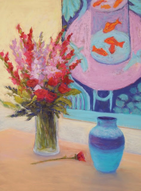 It’s the end of a busy week, and almost the end of January, a month no one seems to be sorry to see end. The sun is shining and it just seems perfect to focus on this colorful painting of flowers that I did recently. My wonderful kids sent me these beautiful flowers for my birthday in November. The print on the wall is one I just love, by the Fauvist artist, Henri Matisse, called “The Goldfish”. It violates so many of the rules that we artists have been trained to follow that it just makes me smile. And because it’s is so playful and colorful, it reminds me that creating art can be tremendously fun!