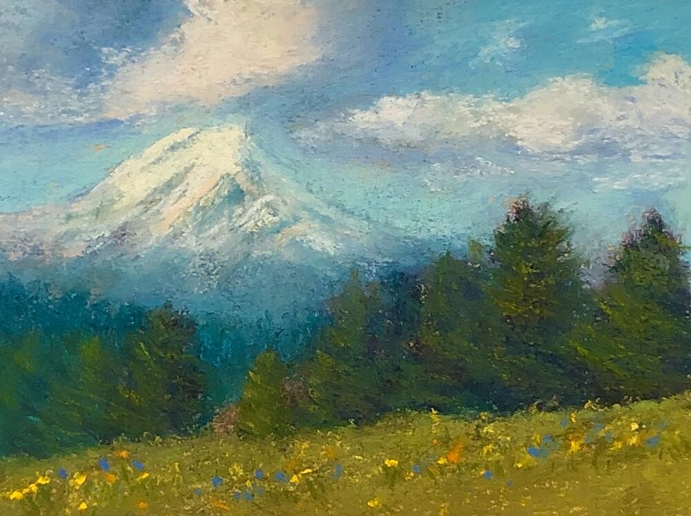 Given the hot summer temperatures we had this week, I was drawn to a scene that while still looking summery also suggested that a cool breeze might be possible. This painting describes the kind of summer day I love, with the warmth and color of summer in this beautiful meadow contrasting with the cold, icy peak above.