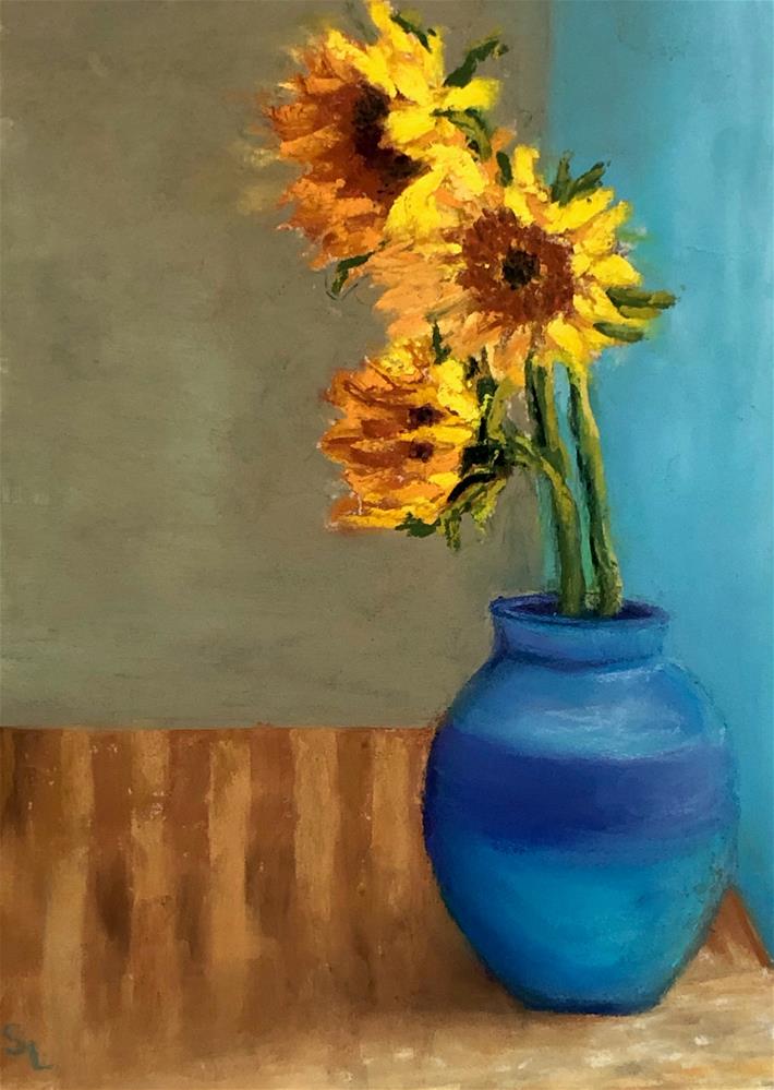 It was a grey, rainy day when I painted this and I think subconsciously, I was looking for something to counteract the gloominess of the day. I ran across my photos of some beautiful, bright sunflowers that I’d placed near a sunny window. The flowers were spotlighted perfectly and I knew that this is exactly what I wanted to paint! These cheerful, yellow sunflowers are to me, the perfect antidote for a rainy day.