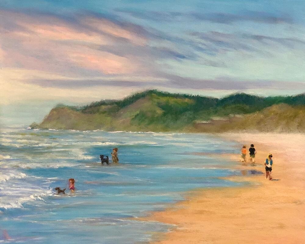 I’m always fascinated by the many ways people respond to being at the beach. Some seem to enjoy a quiet, meditative walk, while others like company and enjoy a lively discussion with a companion. Others find it the perfect opportunity to give their dog some exercise and chase waves with them as this little girl seemed to enjoy. And still others find it (apparently) a time when they need to consult their social media feed while a wave gathers slowly to engulf them. (cue eye roll).