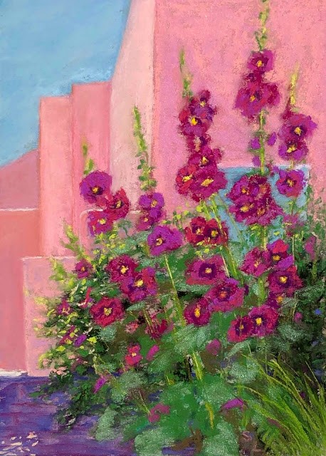 I’m packing my art supplies in preparation for a wonderful conference in New Mexico, just on art. For a few short days, I will take classes, view wonderful paintings, and try not to buy all of the cool art supplies on display. Most importantly to me, I will be surrounded by people who get as excited as I do by the creative process, by color and light, and by changes in the natural world. These hollyhocks, found on a corner in Old Town, Albuquerque always remind me of this wonderful communion of artistic souls.