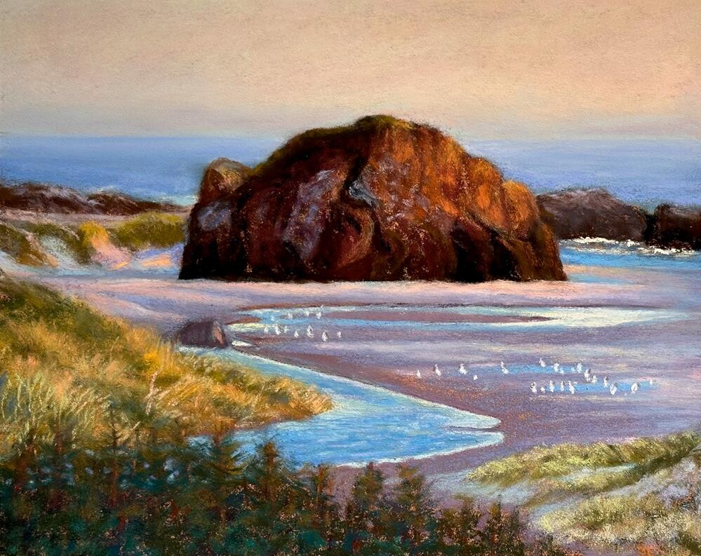 This is one of my favorite areas on the west coast to visit and paint. It has these interesting haystack rock formations in large and small sizes, the beautiful blue water, and I love the way the beach changes colors as the light plays across it. I’ve painted it in early morning when the sun warms the colors of the beach and then later, in early evening, when the setting sun turns the sands into many shades of pink.