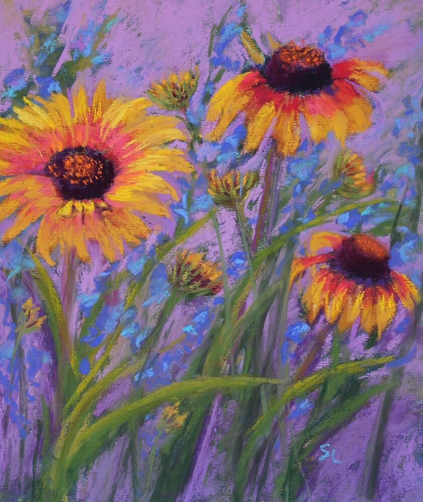 I’m re-posting one of my favorite flower paintings as I’m currently traveling. I love the vivid colors in the Blanket flower (or Gaillardia grandiflora) and the fact that they attract butterflies and bees. Apparently, they’re also great in that deer leave them alone, something I have a hard time believing after watching the deer in my area eat everything in my yard.