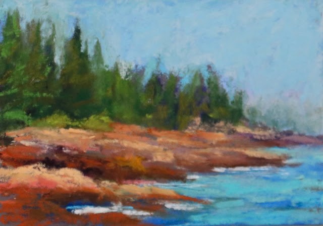 It’s a gloomy, cold, and grey day so I’m feeling lucky that I’m an artist. While outside, the bright, warm, colors of fall are rapidly disappearing to be replaced by cool greys, inside, I can play with the wonderful contrast between the blues of the ocean and the warm colors of these coastal rocks in Bar Harbor. There’s also the cool greens of the trees contrasting with warmer greens and also those same warm rocks. Some days it really pays to be an artist!