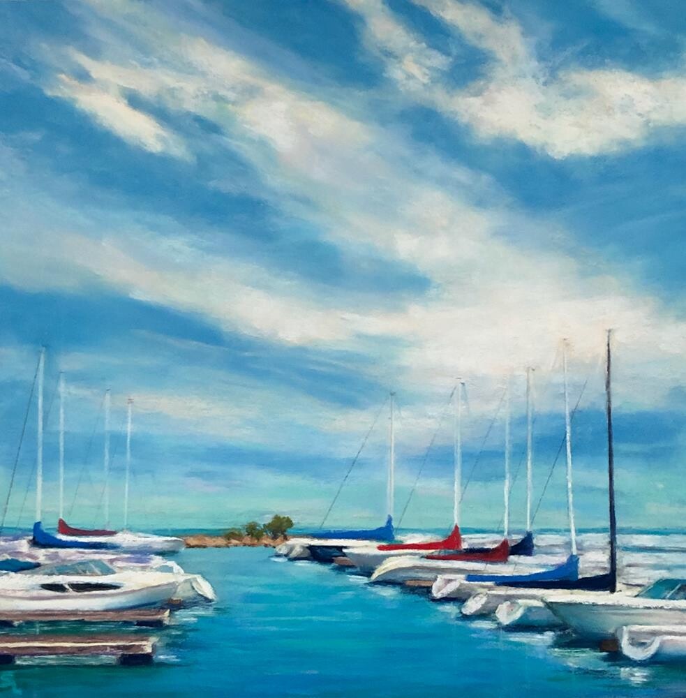 What drew me to paint this image from my recent trip were the contrasts. There was this very tranquil water contrasting with what appeared to be very dynamic clouds and the mostly white boats contrasting with the deep blues, turquoise, and greens of the water. It was a beautiful scene!
