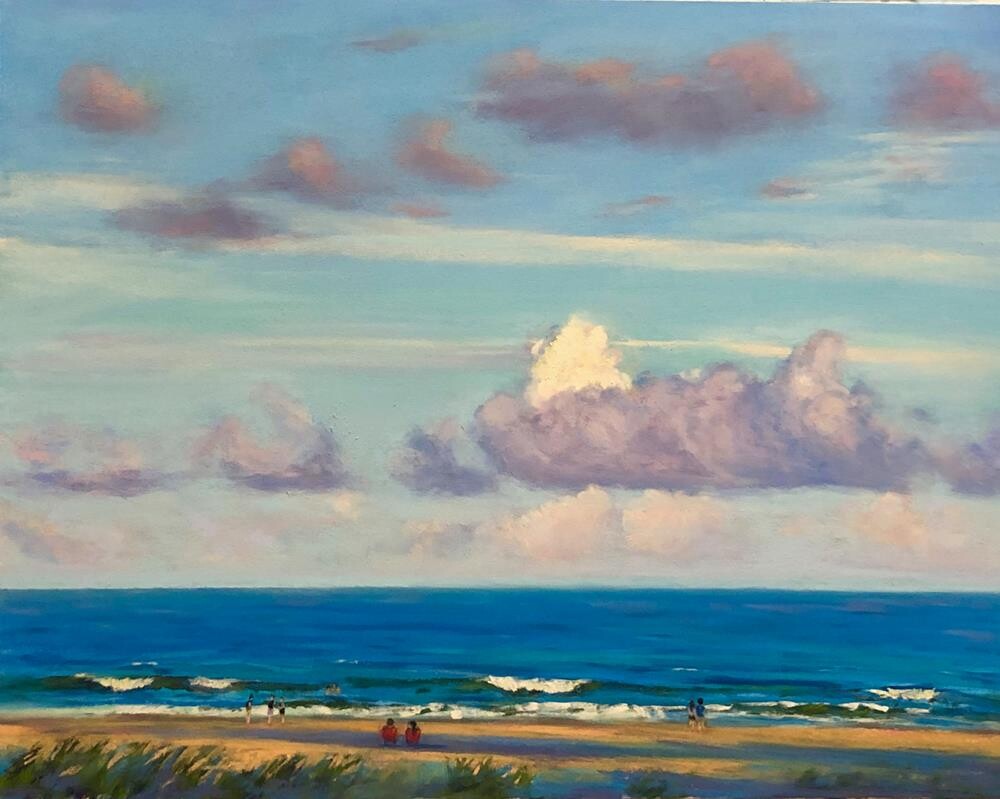 On a grey and dreary day, I painted light, warmth, and happy people trying to enjoy the last rays of sunshine before sunset. I love the contrast between the bands of bluish-purple shadows and the golden, sun-lit parts of the beach. It was also fun to paint the people with some swimming in the water, some former sunbathers now in shadow, and the various people in conversation or silent admiration of the view.