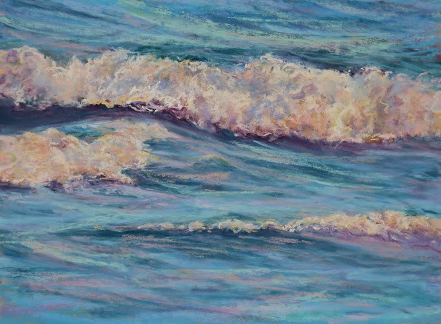 There’s something so mesmerizing about the ebb and flow of waves. Just listening to the sounds of the waves, as they build and then gradually crash on the shore, can lull me into a relaxing stupor. As an additional treat, if you’re patient and wait until the sun is setting, the light can make them glow with all the colors of the rainbow. I just love painting waves!
