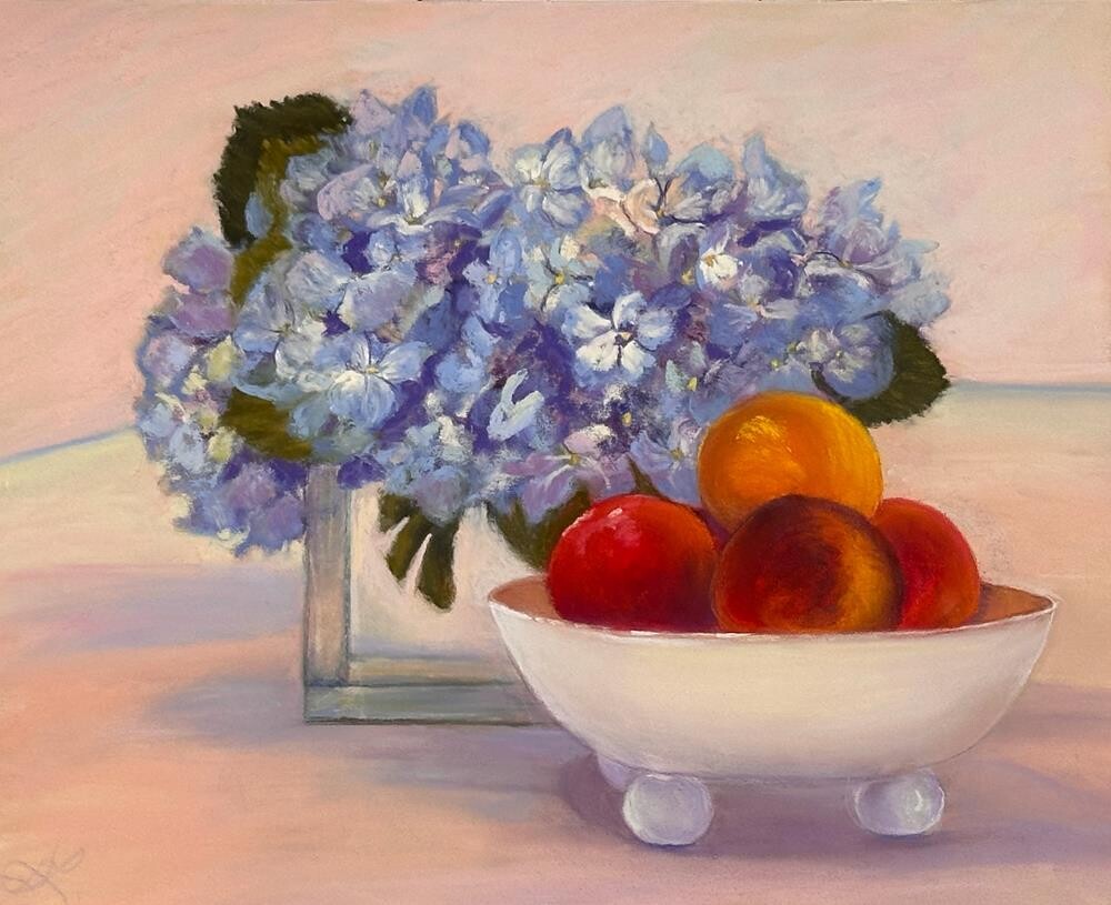 When I was visiting family recently, my son-in-law, Tyler surprised my daughter with these beautiful flowers. When Erinn placed the flowers on her kitchen island near a bowl of fruit, I noticed the contrast between the beautiful blues and purples of the flowers and the lush red, yellow, and orange of the fruit and knew I had to paint this.