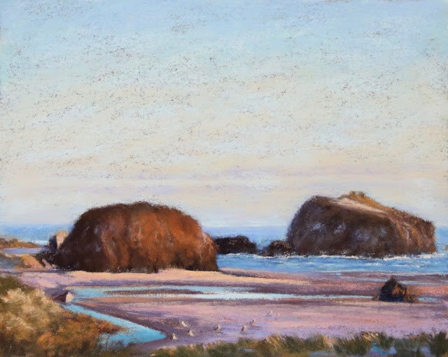 We had the ideal view for someone who loves to paint rocks and water as much as I do. As the sun approached the horizon, it bathed these huge rocks in a warm orange glow, especially the one closer to us. The sea gulls were gathering as if for a huge sunset party along this small stream.