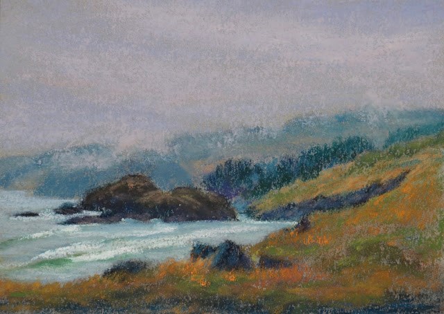 We saw a lot of fog and mist while we were in Oregon and California, which made good photos a little challenging. However, I found out that all of the fog and mist we saw each morning is how the redwoods get much of their moisture. Given how amazing these majestic trees are, what’s a little fog and mist? Besides, I think it lends an air of mystery to this painting I did of the beautiful western coast of the US.