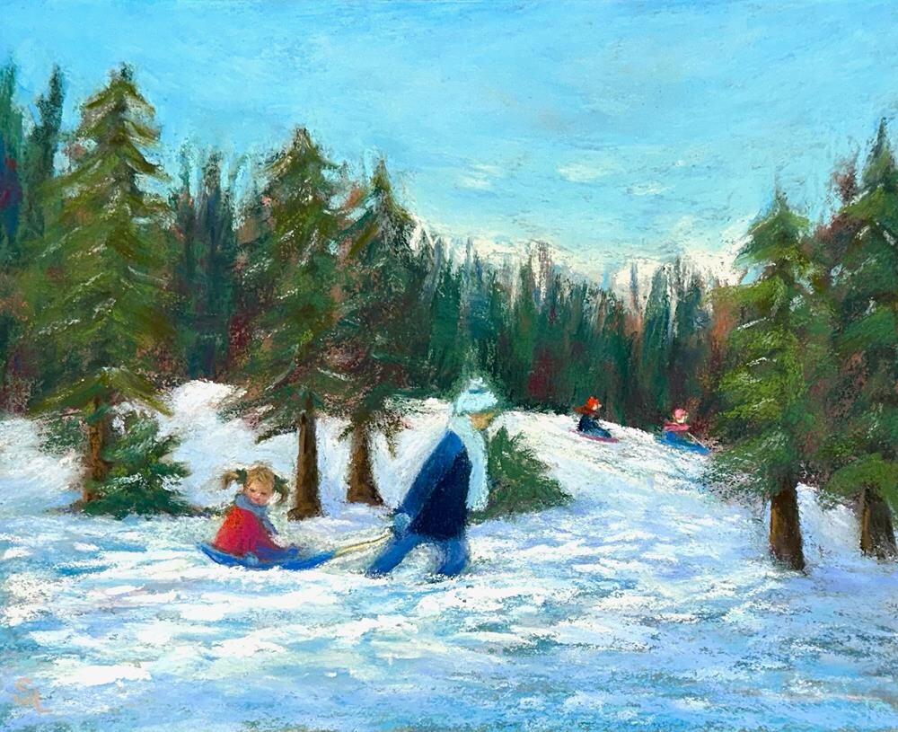 This painting is loosely based on a photo of a snowfall several years ago in the Atlanta area. Given that snow is not that common here in the south, we get out and enjoy it. Everyone grabs something that remotely resembles a sled (garbage can lids, trays, Amazon boxes), finds a hill (plentiful here in the foothills of the Appalachians), and has a wonderful time. This painting is loosely based on a photo of a snowfall several years ago in the Atlanta area. Given that snow is not that common here in the south, we get out and enjoy it. Everyone grabs something that remotely resembles a sled (garbage can lids, trays, Amazon boxes), finds a hill (plentiful here in the foothills of the Appalachians), and has a wonderful time. |
