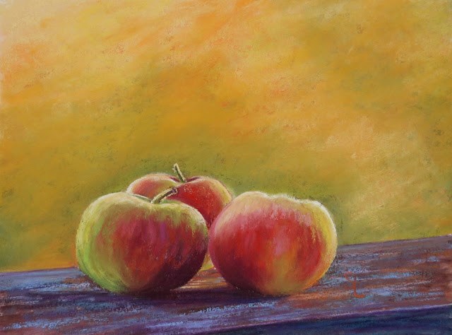 This is the companion painting to last week’s apple painting. I photographed these apples on a railing up in the mountains with a gorgeous southern sugar maple tree behind them. These trees turn bright yellow in the fall and this beautiful tree inspired me to paint the apples with a backdrop of a warm, cheerful, golden sky.