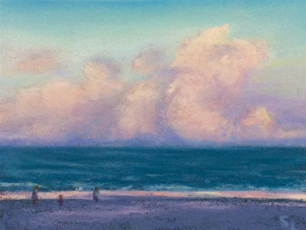 The evening of this sunset, I noticed the luminosity of the clouds, the reflections skimming the beach, and a family out enjoying the last walk of the day.