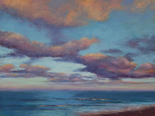 It’s a beautiful, sunny day in Atlanta and I found myself rejecting the painting I had been working on in favor of finishing this much sunnier one. It’s that time of year when I’m noticing that the days are getting gradually longer but it feels like such an excruciatingly slow process that I get impatient. Fortunately, I can choose to paint the longer, sunnier days of spring and remember walking a sandy shore with the sun on my face, beautiful clouds overhead, and the wonderfully rhythmic sounds of the waves in my ears. Ahhhh.