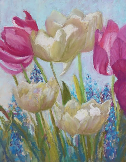 I know it’s not spring yet but I saw some beautiful tulips at the grocery store and had to bring them home. Tulips are, in my opinion, perfect antidotes to a gloomy winter day which is exactly what it was when I painted these recently. As these colorful flowers open, the petals seem to joyously embrace the light and air.