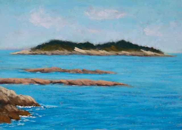 One of my favorite things is this view that I’ve painted so often on location in Maine. It was a sunny day, with a cool breeze, and huge clouds had scudded by leaving only these wispier ones remaining. This is a wonderful summer location from which to paint and one that I’m happy not to be visiting on this cold December day in the south.