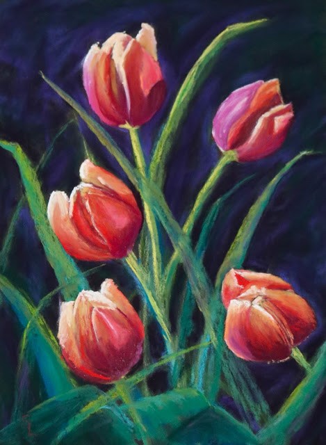 It was raining and dark when I painted this last weekend, on a day pretty much like today. I decided that bright red would be a good antidote for the darkness outside my window and I chose to paint on a relatively new, almost black surface made for pastel artists that I've been wanting to try. The dark surface makes the tulips almost jump out of the background.