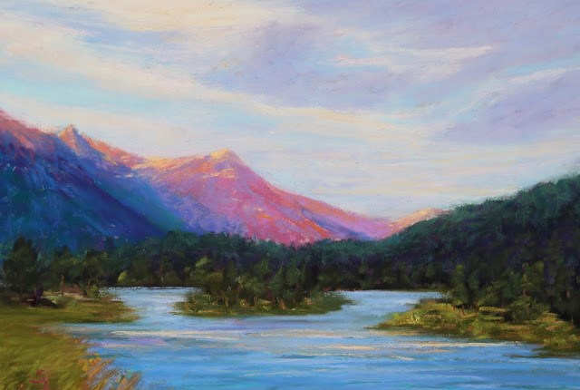I saw this scene after a long hot drive in Norway. We came over during a summer that they were having unseasonably warm weather which we were trying to escape. The Norwegians were ecstatic and we were a little wilted. We arrived at this beautiful place to enjoy cool breezes, the sight of the setting sun and these gorgeous, shimmering mountains.