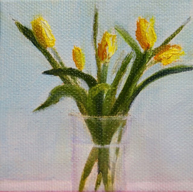 It’s been grey, dreary, and raining for two days soI decided to look on the positive side and try to remember that showers also bring flowers. It’s a little early for tulips but since I was longing for colors other than brown and grey, I painted one of my favorite flowers.