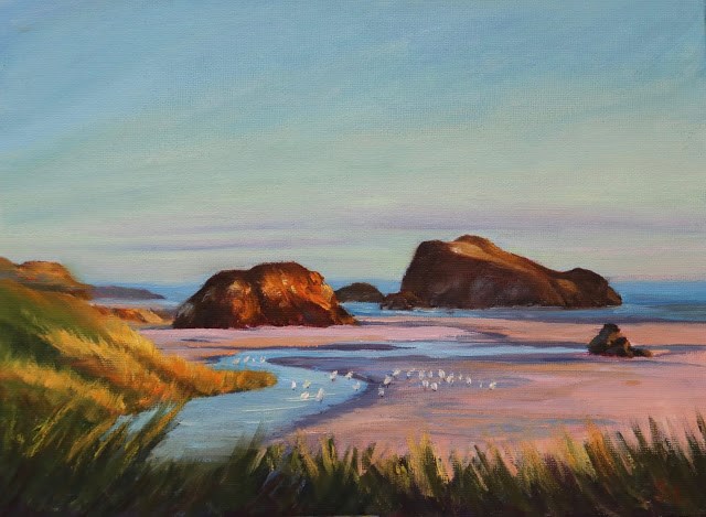 As extreme cold grips much of the eastern U.S., I’m remembering the warmth and sunshine of a summer day. It’s one of the many wonderful aspects of being an artist in that you can create your own reality. While I don’t really mind the cold (except when I have to run in it), I really enjoyed painting and remembering this coastal scene from two summers ago. I loved how all the birds gathered along and within this small stream as if gathering for a great summer party.