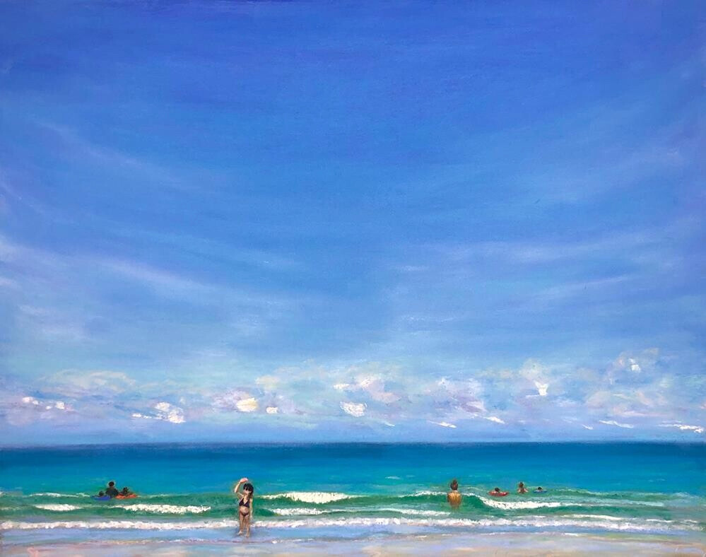 This past weekend I was attending my daughter’s wedding and thus, not producing my weekly painting. So, I offer this work, painted at this time last year, of a lovely beach with a young woman taking a selfie so she doesn’t forget? Or so she can make her friends envious?