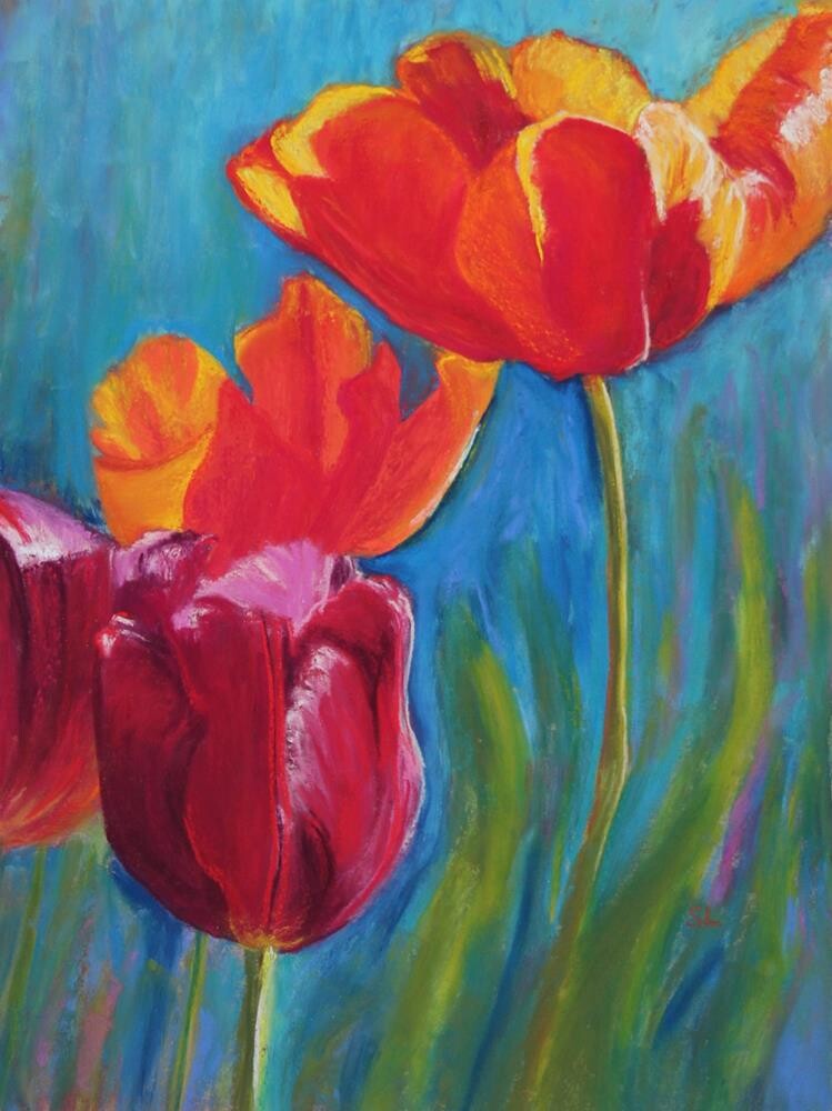 I’ve been thinking about spring lately and that brings to mind tulips – one of my favorite flowers. There are so many colors and even within one tulip, so many variations in colors. I’m traveling this week so I’m sharing some tulips I painted several years ago.