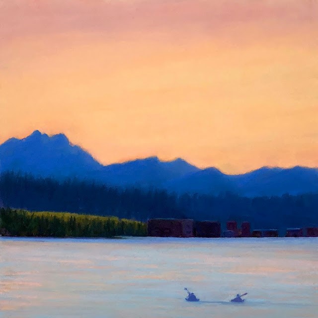 I chose to paint this not only because sunsets are still beautiful in spite of the spread of the corona virus but also because it is such a peaceful scene…..something that’s welcome in the middle of stressful times. And I think those kayakers are maintaining social distance.