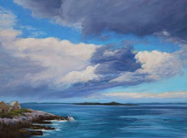 Little did I know when I selected this painting to post this week, that it would also be storming in Georgia. This painting is of a place I love visiting each year called Bailey Island, ME. I can stand in the back yard there and paint quick studies of cloud formations that gather and then dissipate. Can’t wait to visit and paint there again!