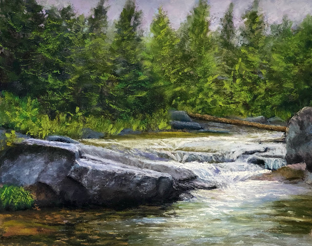 Like many people, I find streams with waterfalls mesmerizing and beautiful, even ones as small as these. I grew up near an ocean so water that moves has always been more appealing than still water though lakes have their own special beauty. This painting is based on a place we discovered while visiting in New Hampshire where the water was delightfully cool after a warm summer day hike.