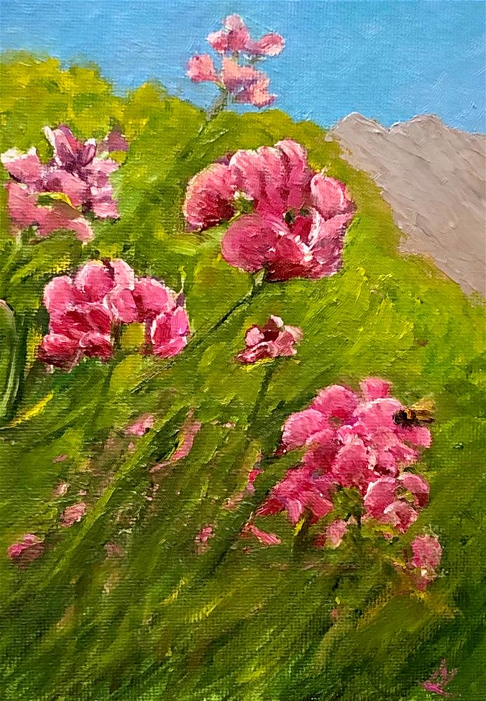 I have been thinking of the west coast a lot lately both because of the terrible wildfires and because I had originally planned to hike and paint out there in July or August. So, since I was missing the west, I decided to paint it from my many photos, focusing on these striking hot pink flowers, called “Sweet Pea” or Everlasting Pea.” You can find them as I did, scattered all over many bluffs along the Pacific coast and mixed in with delicious berries. If you’ll look closely, you’ll see a visitor on one of the flowers.
