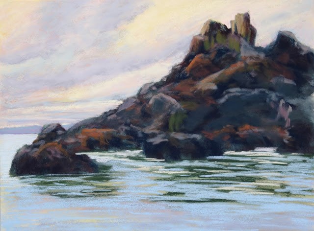 I saw these rocks while on the coast this summer, and took lots of photos knowing even then that I would be painting them. As I got closer to them, I was amazed to see all of the different colors that from a distance looked only dark grey and brown.