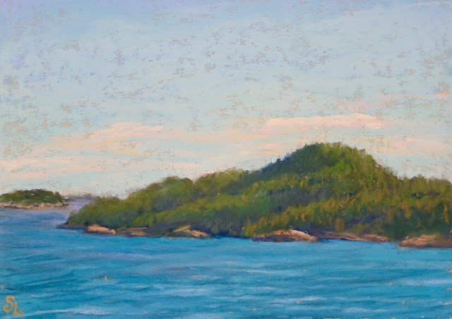 I painted this from a hillside on Orcas Island, off the coast of Washington. Imagine cool breezes, a sunny day, and a harbor and distant islands as they might have appeared long, long ago: quiet, beautiful, peaceful.