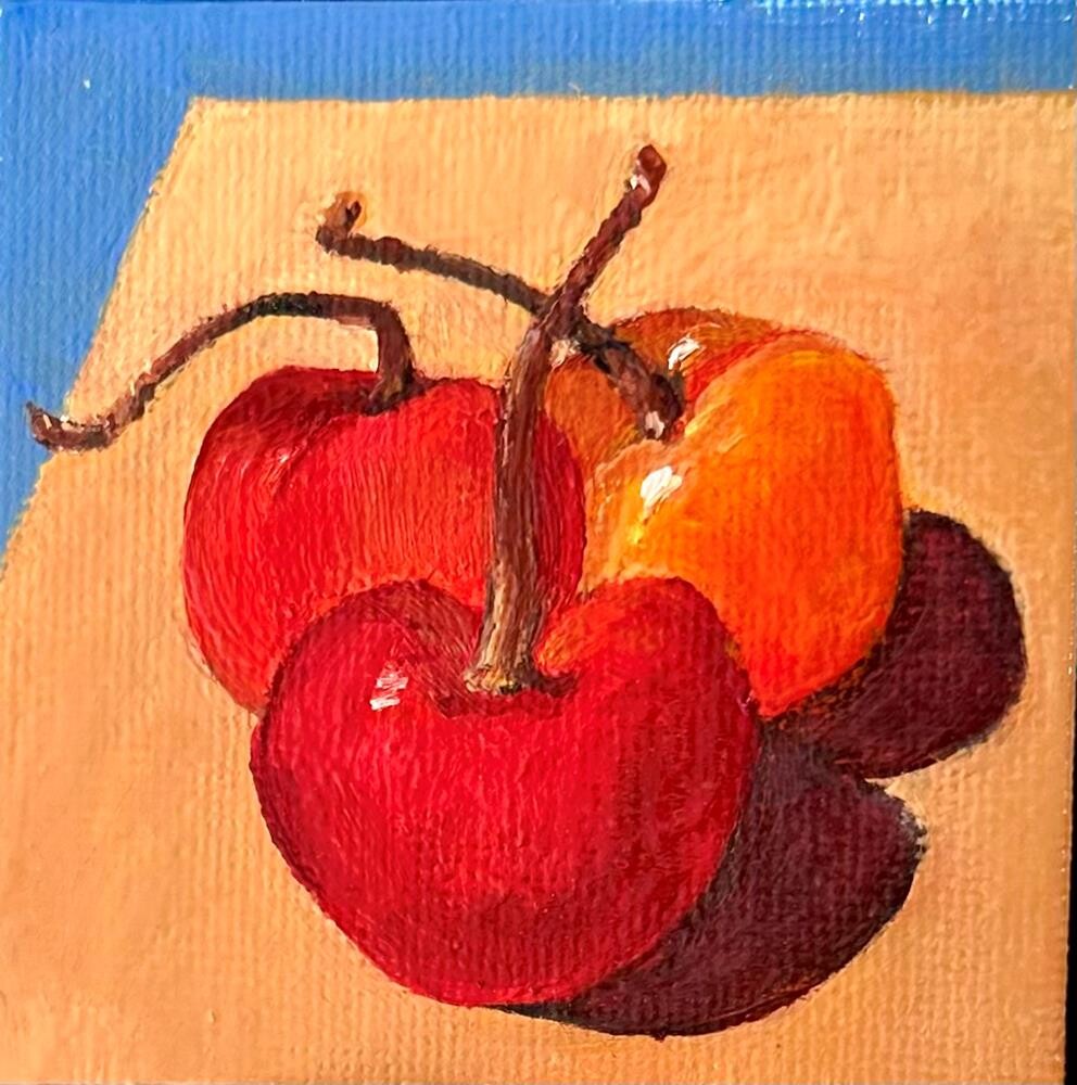 I’m still experimenting with oils while I’m away visiting family. My granddaughter loves to eat these cherries and I love to paint their beautiful colors.