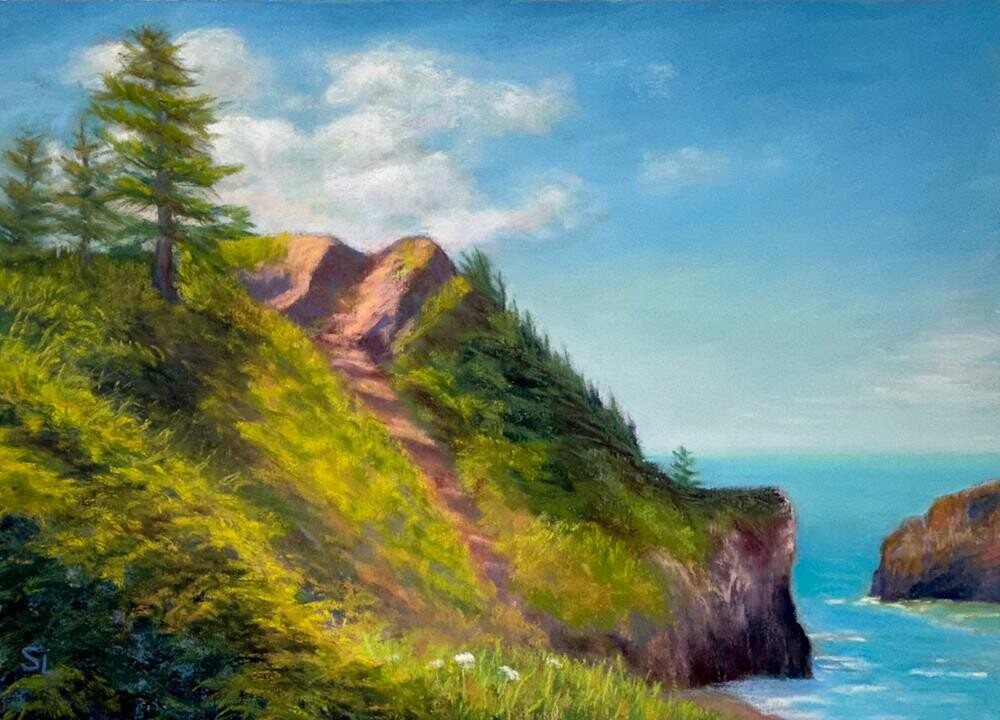 There are a lot of factors that influence what I paint but sometimes it’s as simple as I’m repeatedly drawn to a particular image. I’ve been focused on creating larger paintings of skies lately – particularly blue skies since we haven’t seen much of those during a week of rainy days. When I was on the west coast one summer, I saw all the gorgeous greenery covering this sandy cliff and the rather steep path winding down to a small beach below. With the blue skies above and that beautiful turquoise sea below I had to paint this scene. When I look at this, I can still hear the call of gulls and the smell of salt in the cool breeze.