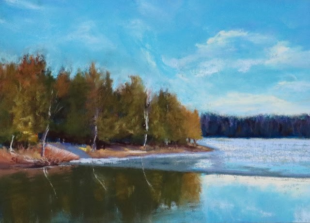 Recently, I found a great example of winter slowly giving up its grip when I saw this pond half frozen and half open water. Or maybe this is a “Before Spring” and “After Spring” example? However you might interpret this scene, I loved seeing the beautiful reflections in the water with the warm greens and orange of the trees contrasting with the cool blue of the sky.