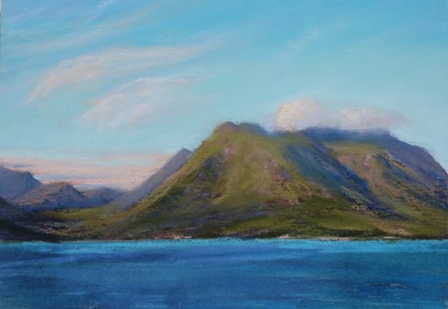 We found the Isle of Raasay by accident when we couldn’t find a vacancy on the Isle of Skye, one of our favorite areas in Scotland. The Isle of Raasay, one of the islands making up the Inner Hebrides, is smaller than Skye and also more quiet, less touristy, but I think just as beautiful. It ended up being a very lucky find for us. This painting is looking across the Sound of Raasay at the east coast of Skye.